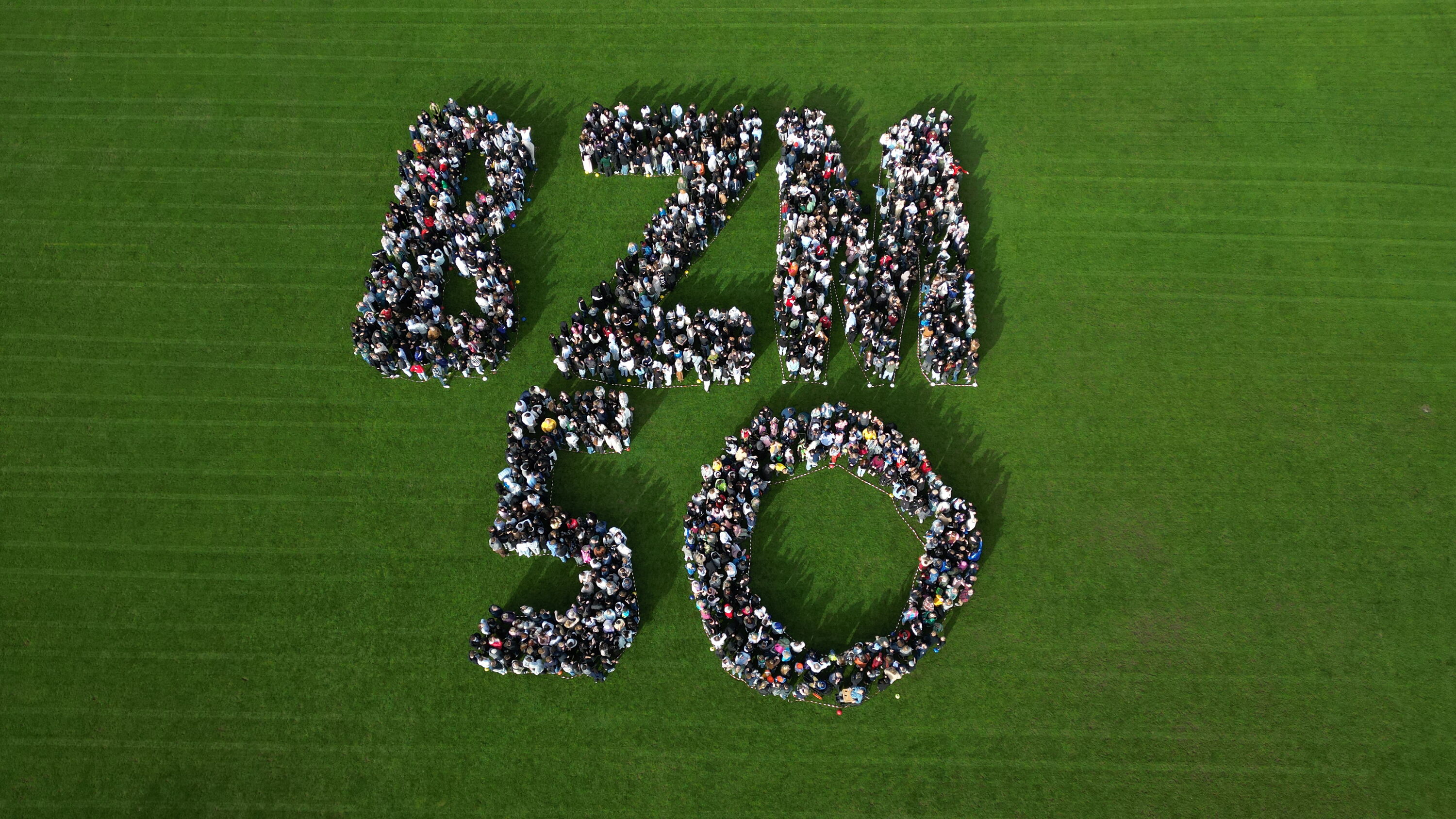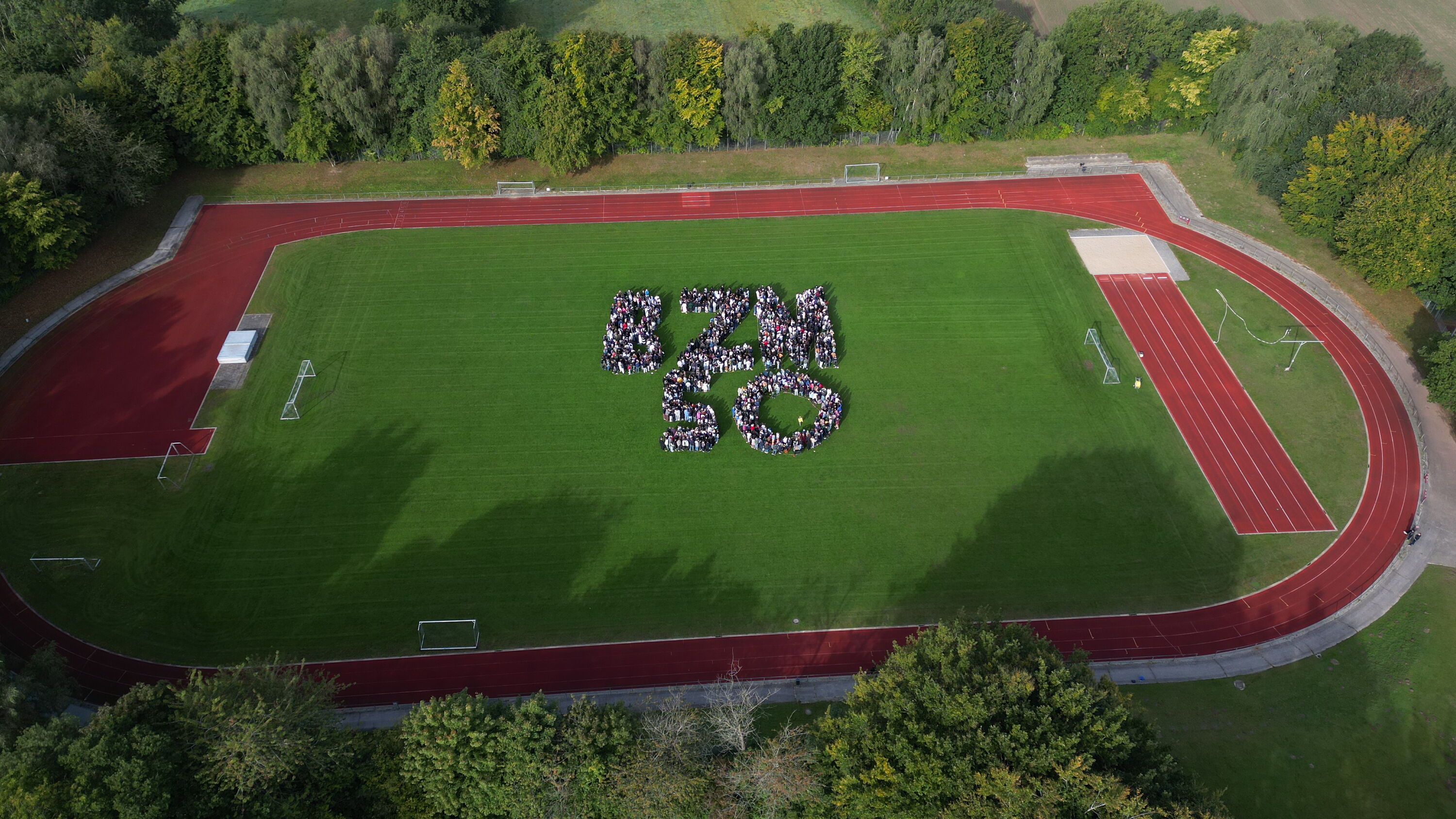 Das Gebäude des Bildungszentrums Mettenhof feiert 2025 sein 50-jähriges Bestehen. Dieses Jubiläum wollen die drei Schulen des BZM im Schuljahr 25/26 mit mehreren kleinen Aktionen feiern. Zum Auftakt haben alle Schülerinnen und Schüler sowie die Kollegien der LEG, der LNS und des THG ein gemeinsames Standbild auf dem Sportplatz organisiert.
